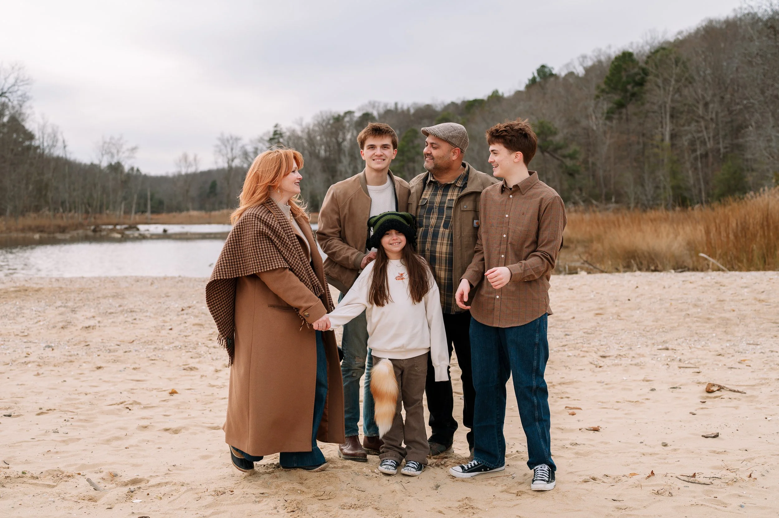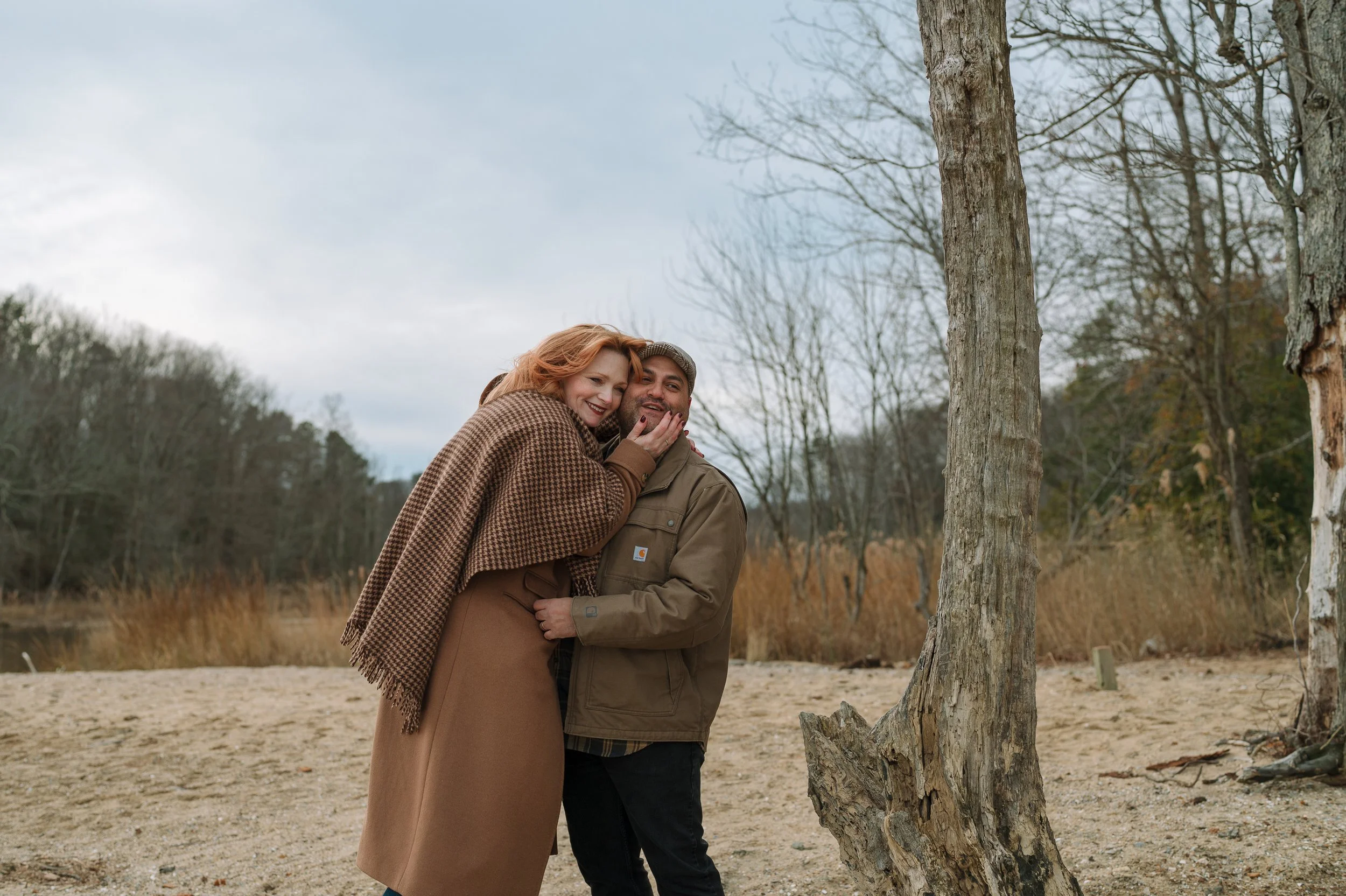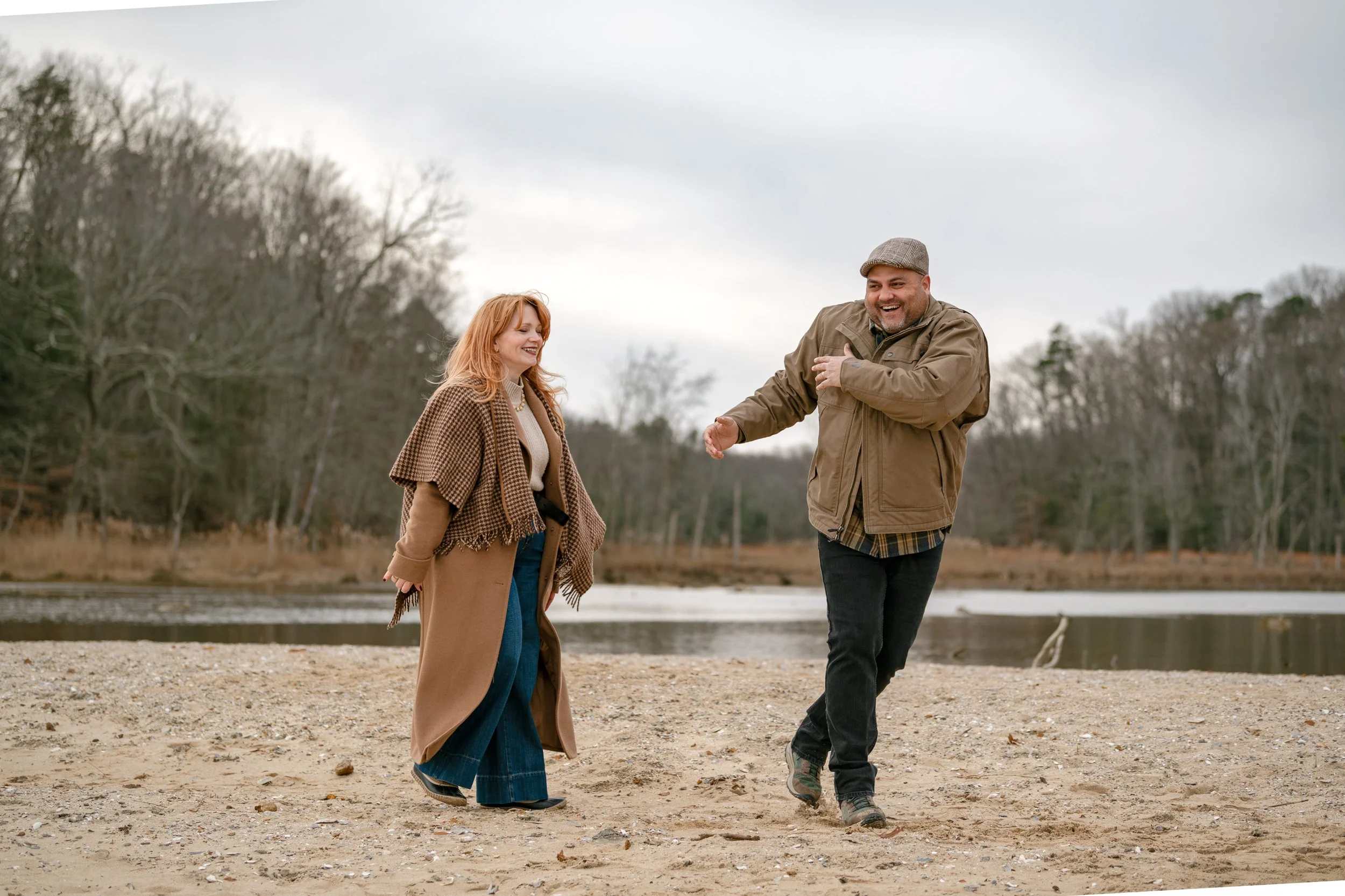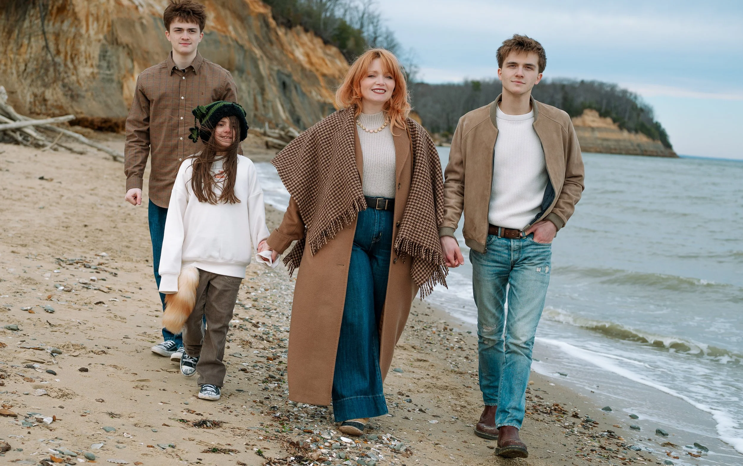 This wasn’t a “stand here, everyone look pleasant” kind of family session. It was walking trails, hands in pockets, inside jokes, layers zipped and unzipped, and the kind of Southern Maryland winter light that pops in and out and curls up wind when it feels like it, just to keep this photographer on her toes.